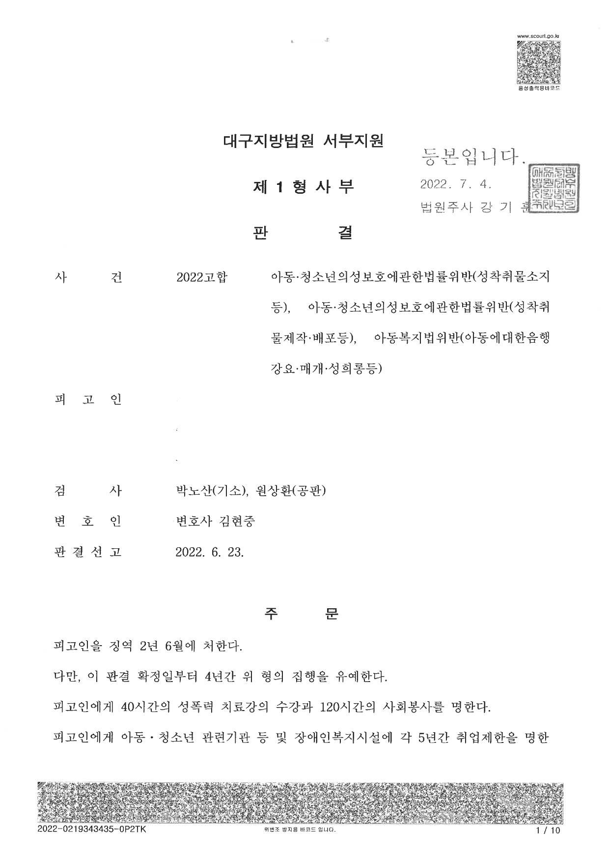 이에 피고인은 아청법 사건으로 유명한 변호사를 수소문하여 저에게 연락을 주게 되었고, 이에 피고인의 사건을 수임하여 사건을 담당하게 되었습니다.