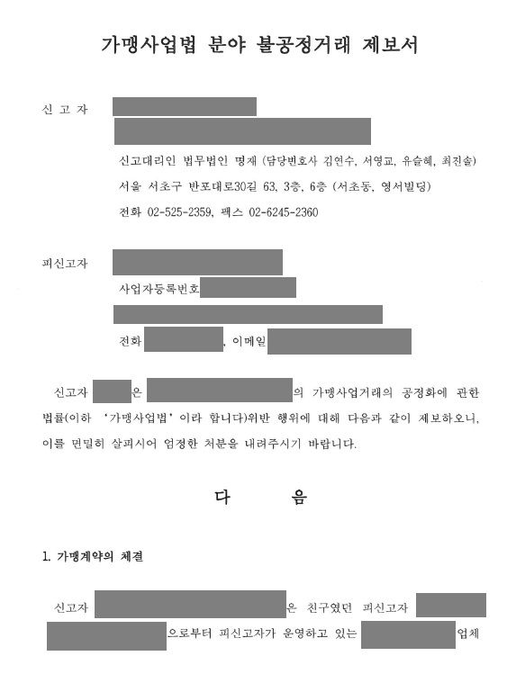 결국 저는 이러한 가맹사업법 위반 사항을 정리하여 공정거래위원회에 제보하기로 하였고, 공정거래위원회의 처분 결과를 지켜본 후 형사 고소나 민사소송 등 가능한 법적 조치를 이어가기로 하였습니다.