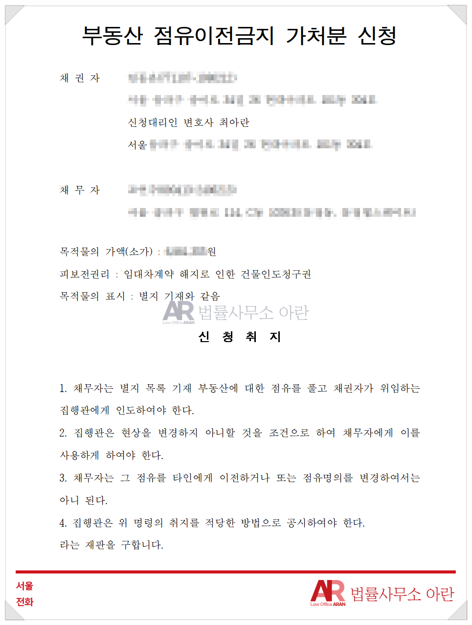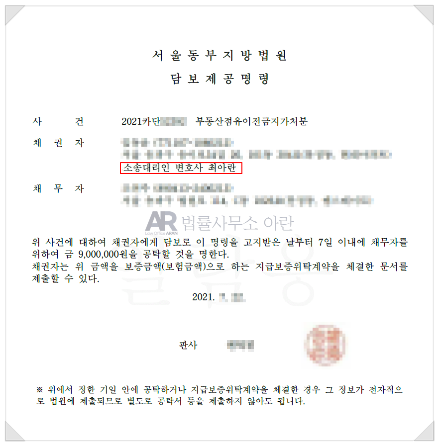 제가 실제로 진행하였던 사건에서 제출되었던 신청서부터 담보제공명령, 결정문 및 집행까지 차근차근 살펴보겠습니다.