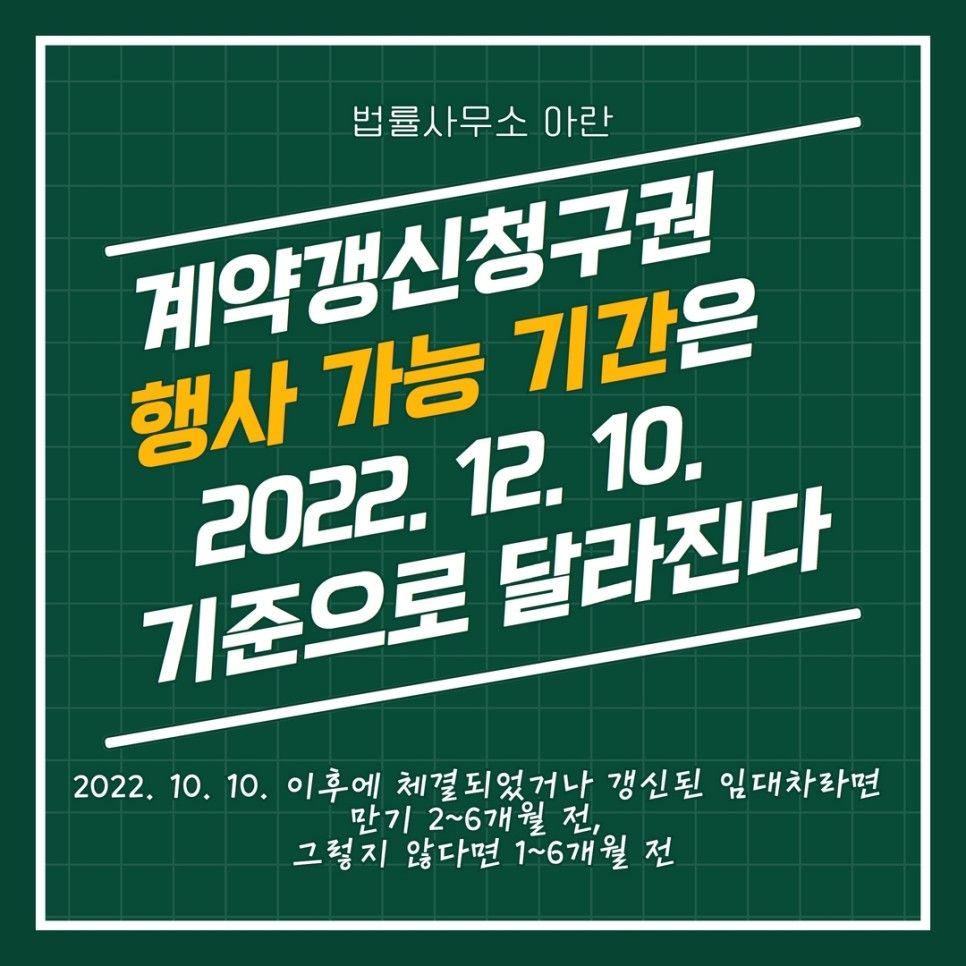 결국 위 내용을 종합하면 2020. 12. 10. 이후에 최초로 체결되거나 갱신된 적이 있는 임대차계약이라면 임차인은 만기일로부터 6개월 전부터 2개월 전까지의 기간 내에 계약갱신요구를 하면 되고, 그렇지 않은 임대차계약이라면 임차인은 만기일로부터 6개월 전부터 1개월 전까지의 기간에만 갱신요구를 하면 됩니다.