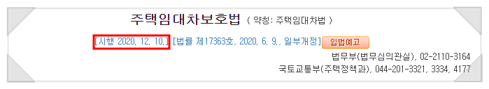 최변 코멘트) 따라서 2020. 6. 9. 개정된 주택임대차보호법의 시행일은 2020. 12. 10.입니다. 법제처 홈페이지에서 주택임대차보호법을 검색해보면 [시행 2020. 12. 10.]으로 명시되어 있음을 확인할 수 있습니다.