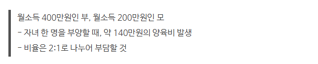 부모가 모두 소득이 있는 경우라면, 해당 부모의 소득액에 비례해서 양육비가 산정되게 됩니다. 이렇게만 설명드리면, 이해가 안되실 수 있는데요. 예시를 들어보겠습니다.