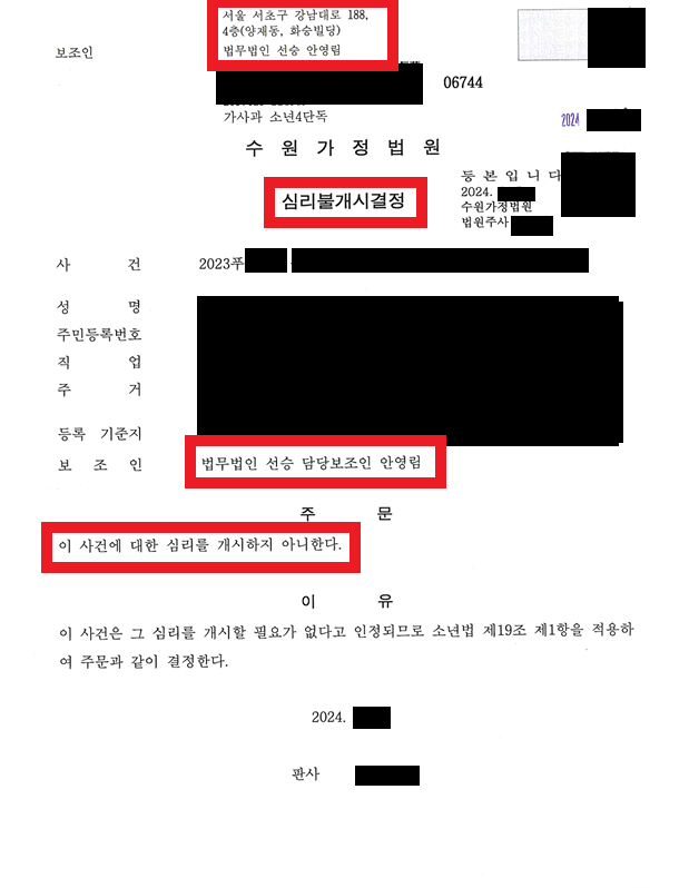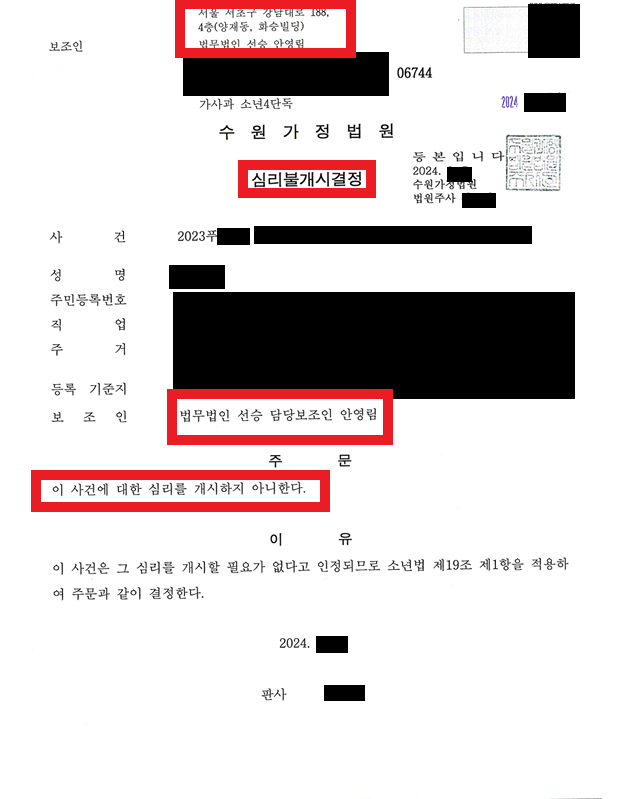 가정법원에 사건이 접수된 뒤 7개월이 지났는데, 얼마 전 2명 모두에 대해 심리 불개시 결정이 나왔습니다. 의뢰인 2명 모두 심리 불개시 결정을 받아, 다행히 앞으로 진학, 취업 등에 부정적인 영향은 없을 것입니다.