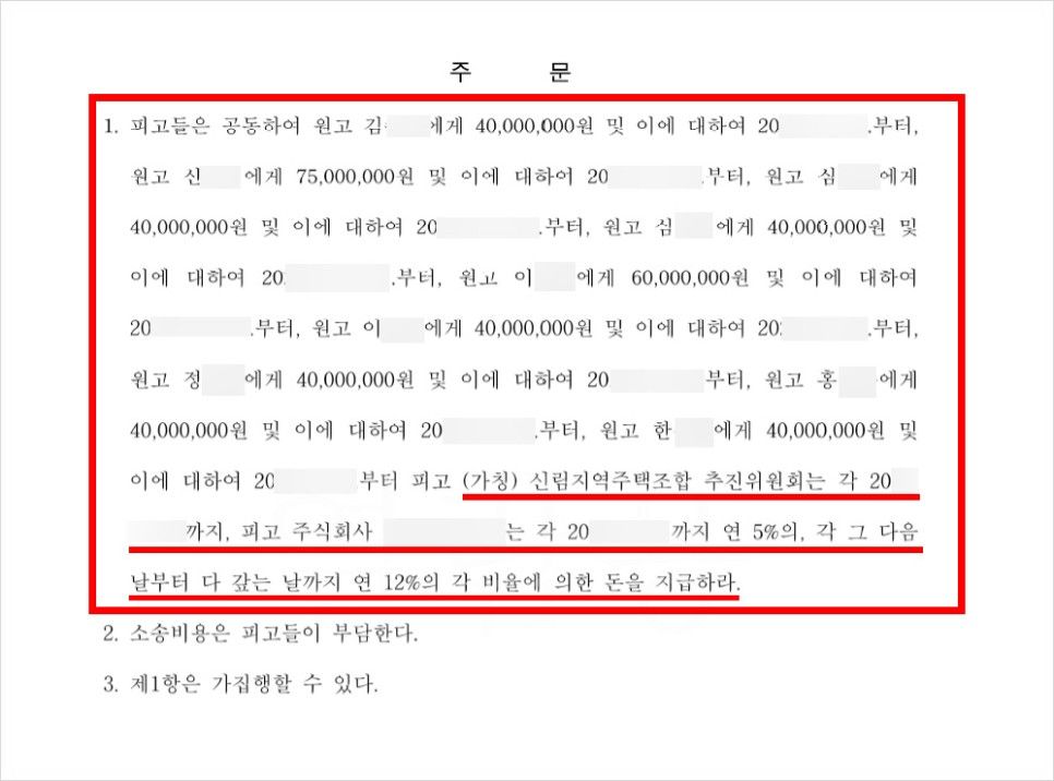 이번 사례는 그동안 최동욱 변호사가 다수의 민사소송을 진행하여 승소한 신림지역주택조합과의 사례이며, 의뢰인들은 최동욱 변호사를 통해 피해금액을 실제로 회수하였습니다.
