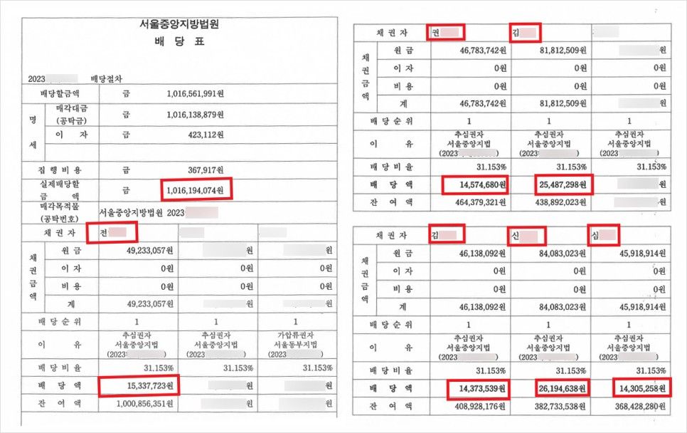 하지만 위의 완전승소 판결에도 불구하고 신림지역주택조합이 의뢰인들에게 해당금액의 반환을 지속적으로 미루거나 거절하여, 최동욱 변호사는 신탁사(한국자산신탁)를 상대로 강제집행을 실시하였고, 그 결과 의뢰인 15명은 아래와 같이 합계 약 3억원 의 납부금을 실제로 회수할 수 있게 되었습니다.