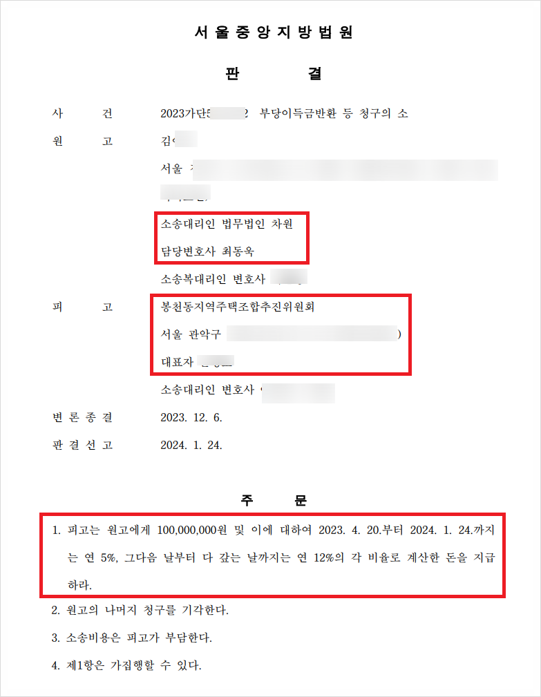 [봉천동 지역주택조합을 상대로 한 전액 승소 판결]