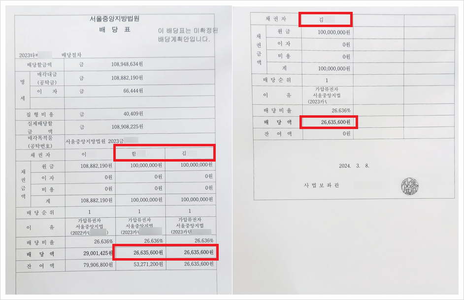최동욱 변호사는 위 승소판결 이후에도, 의뢰인들의 피해금원 실제 회수를 위하여 다각도의 강제집행을 진행하였습니다. 이에 따라 의뢰인들(함00, 김00, 김00)은 아래와 같이 법원 배당절차를 통해 2024. 3. 13. 약 8,000만원 (인당 2,660만원)을 실제로 회수하게 되었습니다.