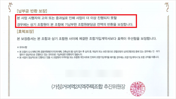 의뢰인(이00)은 조합가입계약 체결 당시 추후 사업이 진행되지 못할 경우, 기납부한 조합원분담금 전액의 반환을 보장한다는 내용의 계약안심보장증서를 교부받았습니다.
