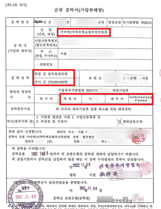 최동욱 변호사는 민사소송을 제기함과 동시에, 한국자산신탁에 예치되어 있던 조합원분담금 및 업무대행비에 관하여 가압류를 신청하였고, 서울동부지방법원은 아래와 같이 의뢰인(이00)의 채권가압류를 인용하는 결정을 선고하였습니다.