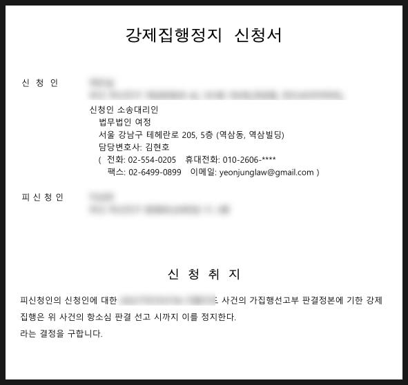 강제집행정지까지 걸리는 시간은 제가 수행한 사건을 기준으로 단 1일 만에 해결되었습니다.