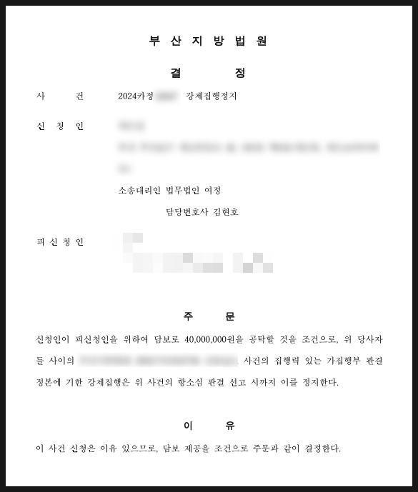 제가 강남실씨를 대리해서 부동산 강제집행정지결정을 신청하고, 얼마 지나지 않아 결정이 내려졌습니다.