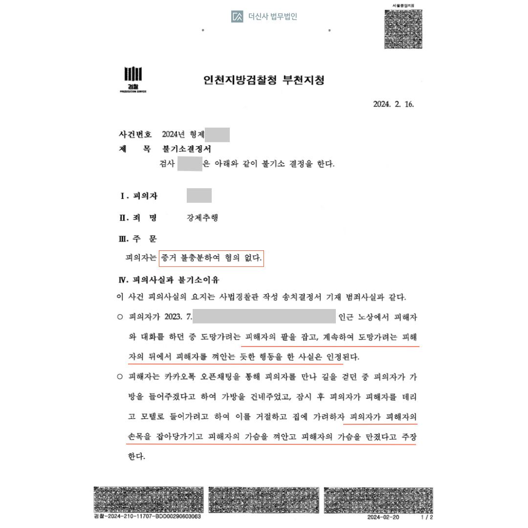 의뢰인은 강제추행의 죄에 대하여 증거 불충분하여 혐의 없음을 받았습니다.