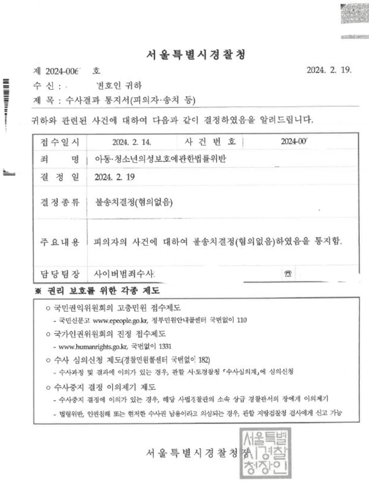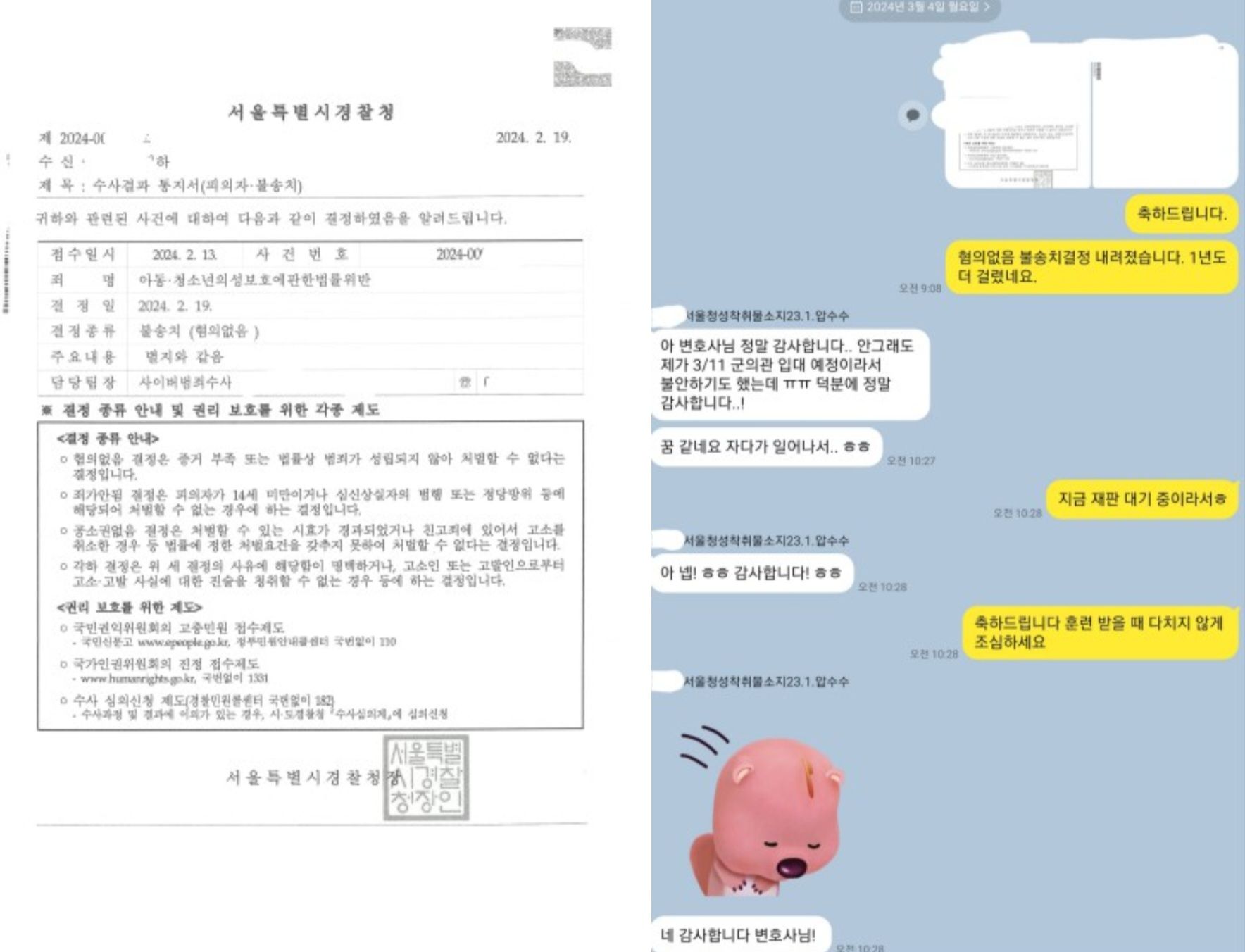 통매음 무혐의 5건과 통매음임에도 압수수색까지 이루어진 사안과 관련하여 포스팅을 할 것도 있고 이혼소송 관련 포스팅, 일상 포스팅 올린 것들이 있는데 바쁜 일정을 소화하다보니 계속 밀리고 있는 상황입니다. 자주 다니는 서울경찰청에서 아동성착취물소지죄에 대하여 추가로 2건 불송치결정을 받았는데 지금 시점에서는 압수수색 등이 마무리 된 건이라 시의성이 떨어지기도 하고 다른 포스팅들도 밀려있는 상황이라 구체적인 내용까지 밝히지는 않겠습니다.