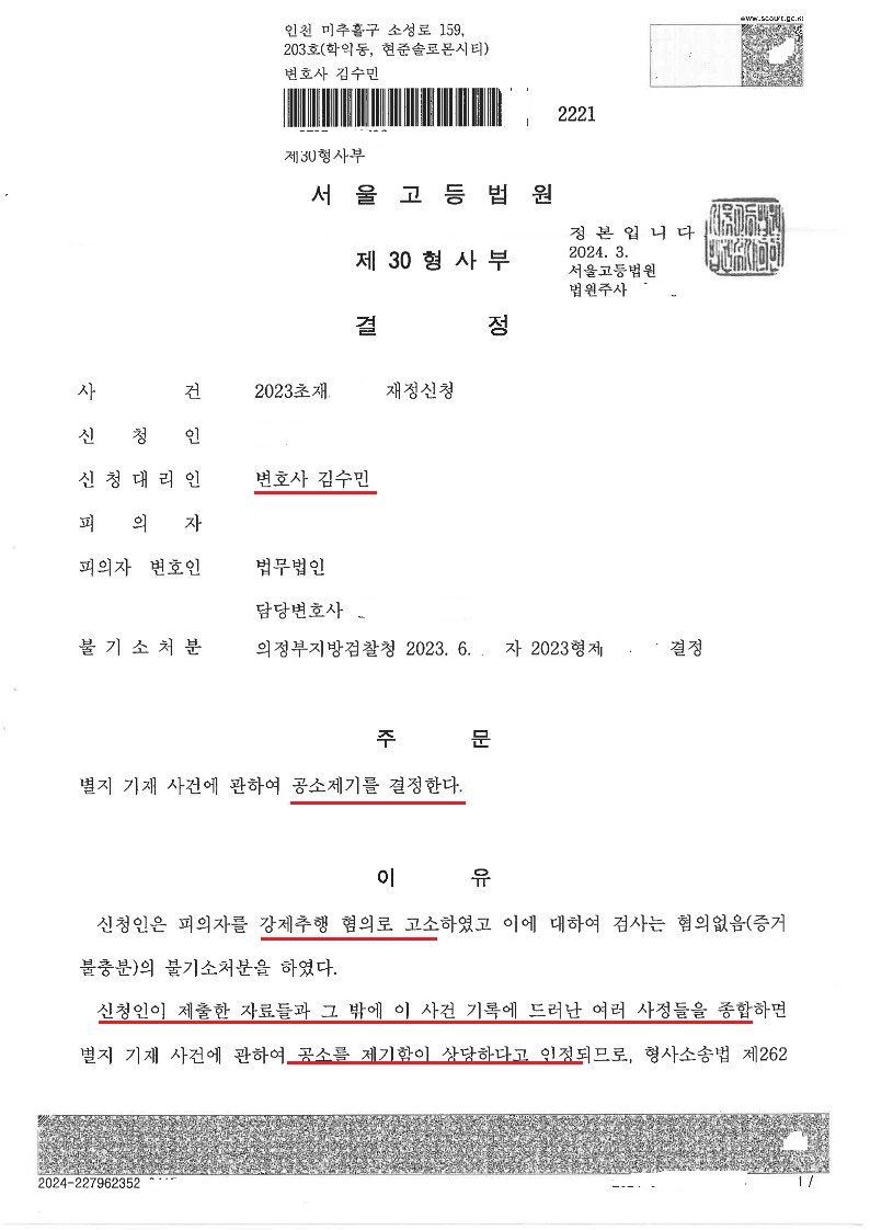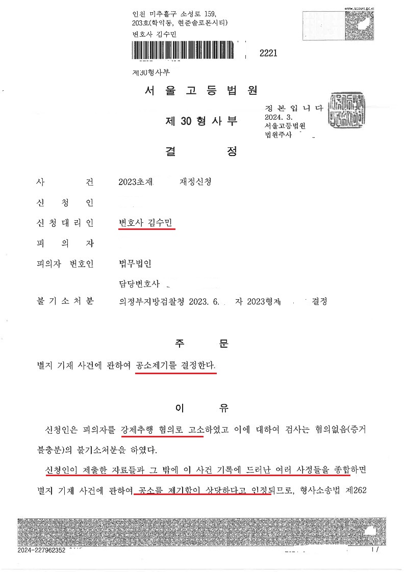 재정신청은 인용되었고, 공소제기 명령이 떨어져 가해자는 법정에 서게 될 운명에 처하게 되었습니다.