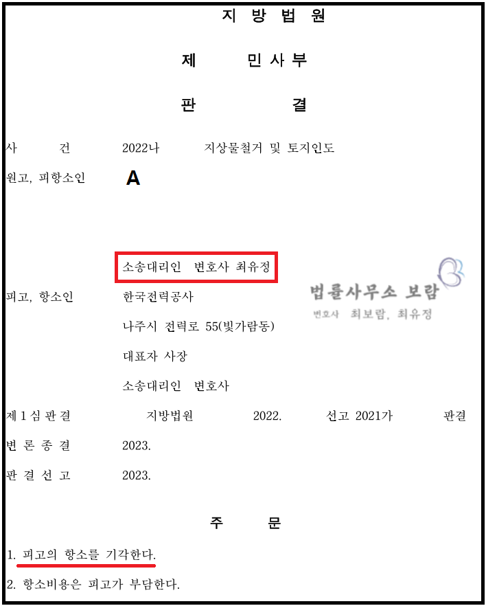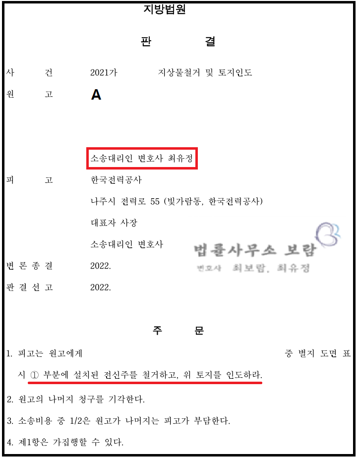 결국 법원은 양 당사자의 법률적 주장 및 사실관계를 면밀히 검토한 뒤, 1, 2심 모두 최보람, 최유정 변호사의 주장을 받아들여 의뢰인 A의 청구가 권리남용에도 해당하지 않는다고 판단하여 전신주(전봇대)를 철거하라는 원고 승소 판결을 하였습니다.