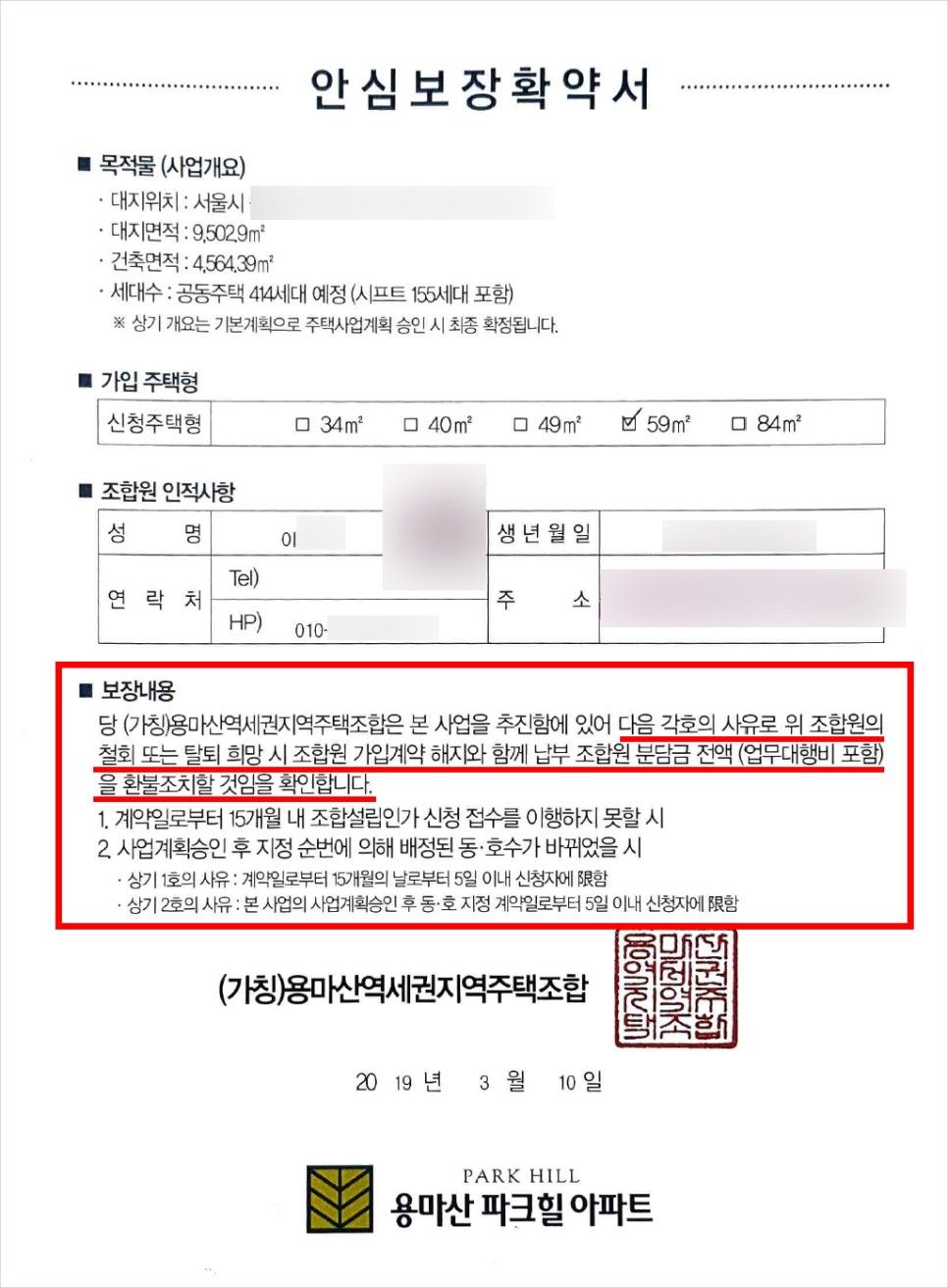 특히 용마산역세권 지역주택조합 또한 이전 포스팅에서 다수 언급하였던 '안심보장확약서 (안심보장증서)'를 계약 당시에 조합원들에게 나누어 주었는데, 해당 안심보장확약서 또한 총회의 의결을 거치지 않은 채 작성된 증서이기 때문에 법적실효성이 없는 문서입니다.