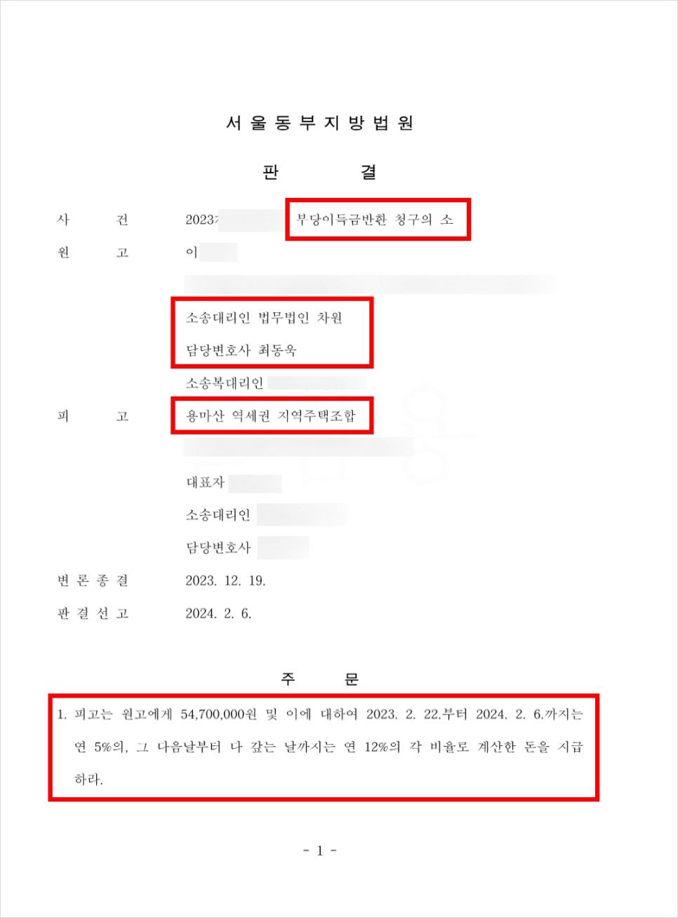 최동욱 변호사는 이번 재판에서 승소하여 강제집행을 실행할 수 있는 집행권원을 얻음으로써, 의뢰인의 피해회복에 한발 더 앞서게 되었습니다. 최동욱 변호사는 그동안 의뢰인들의 피해회복에 좀 더 진심으로 집중하는 법률조력을 제공해 드리기 위하여 의뢰인이 실제로 분담금을 환불 받았을 때에만 성공보수를 받는 것으로 의뢰인분들로부터 신뢰를 쌓아왔습니다.