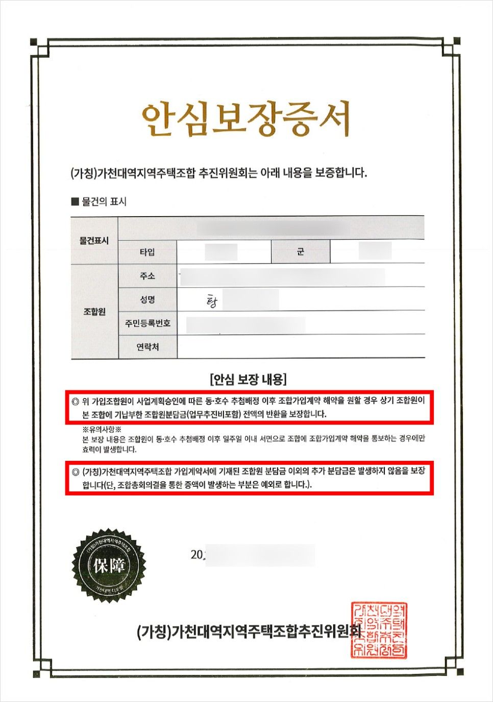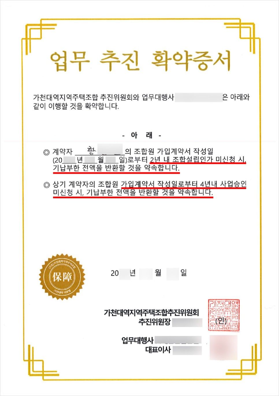 지역주택조합사업은 조합원이 사업 시행의 주체가 되어 사업추진과정의 모든 책임을 져야하기 때문에 신중한 가입을 필요로 합니다. 하지만 조합측에서 '분담금 확정' 혹은 '납부금 전액 환불보장'등의 내용이 담긴 안심보장증서를 계약 시에 교부할 경우 해당 내용에 안심하며 계약을 체결하게 되는 경우가 매우 많습니다.