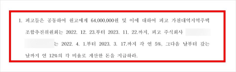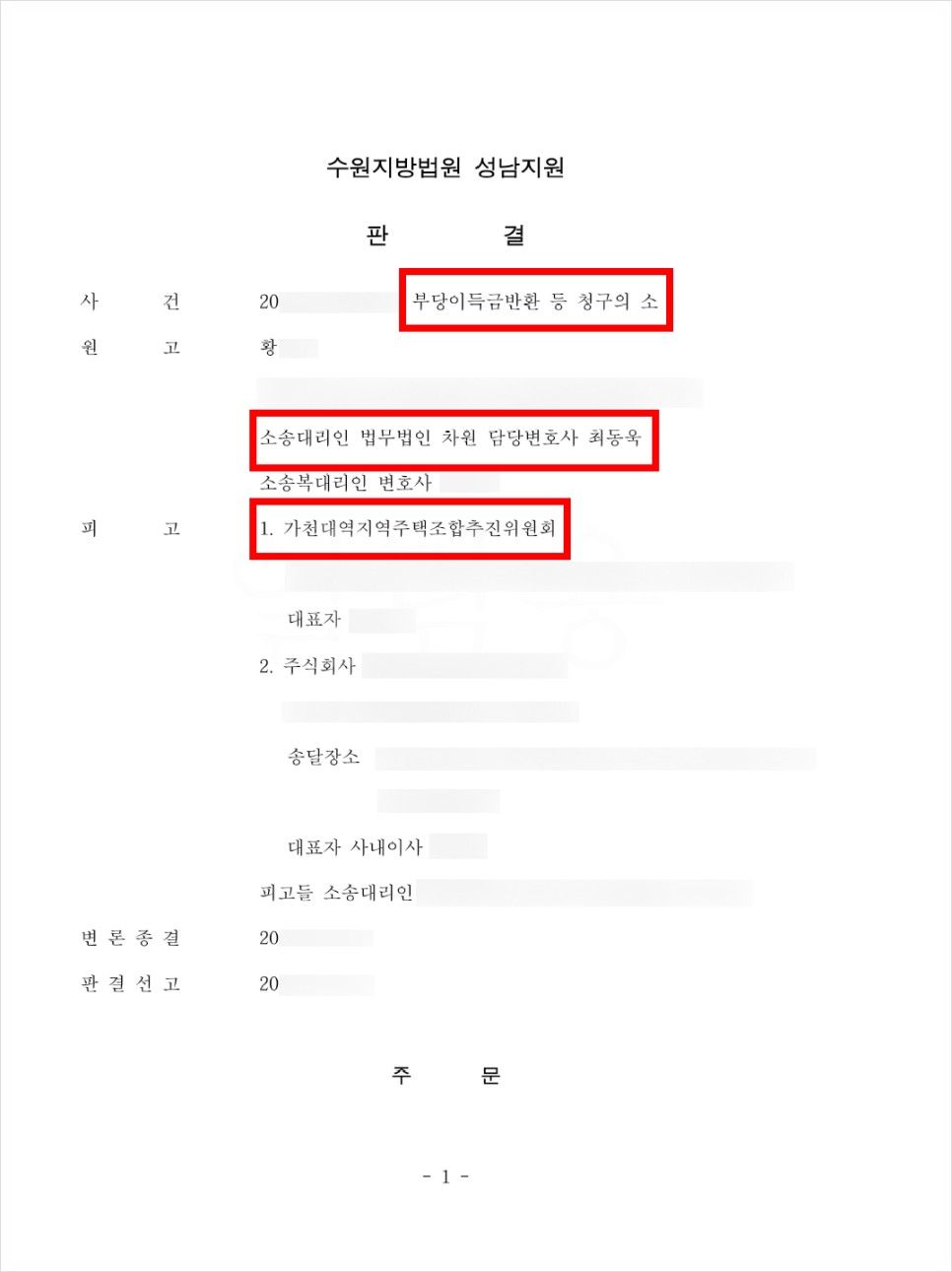 그 결과 수원지방법원에서는 최동욱 변호사의 주장을 받아들여 의뢰인(황00)이 납부한 분담금전액 6,400만원(업무대행비 포함) 및 그에 대한 5%~12%의 지연이자의 반환을 명하는 전액 승소판결을 선고하였습니다.
