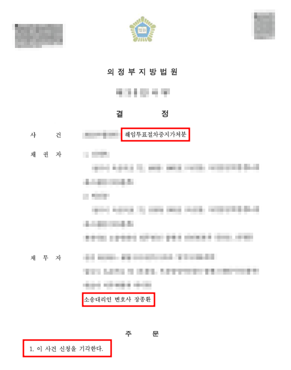 해임투표의 당사자였던 입주자대표회의 회장은 이 사건 해임투표가 절차적으로 하자가 있으며 자신에 대한 해임사유가 명백하지 않다며 해임투표가 진행되는 것 그 자체를 막아달라고 가처분을 구해왔습니다. 그러나 장종환 변호사는 채권자의 주장만으로는 해임투표절차가 진행되는 것을 막을 수 없다는 점을 주장 증명하였고, 이에 법원은 채권자 회장의 신청을 기각하고 채무자 승소 판결을 내렸습니다.