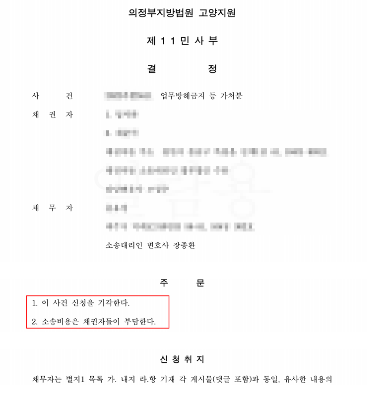 이 사건은 채무자가 채권자의 블로그나 인스타 등에 단 댓글들로 인하여 채권자가 업무방해, 명예훼손 등의 피해를 입고 있다며 채무자의 댓글 등을 게시하는 것을 금지하는 가처분을 구한 사건입니다.