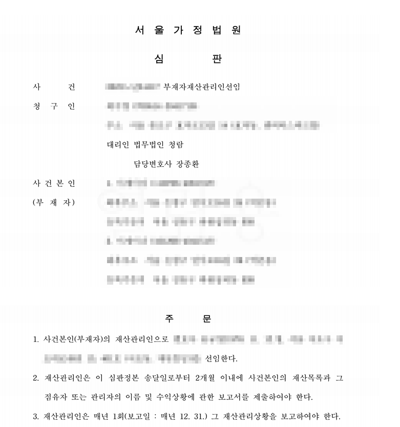 이 사건은 의뢰인의 딸이 외국에서 사망하였으나 손녀들 역시 외국에 거소를 두고 있어 손녀 앞으로 상속받은 재산의 관리를 위해 부재자재산관리인의 선임을 청구한 사건입니다.