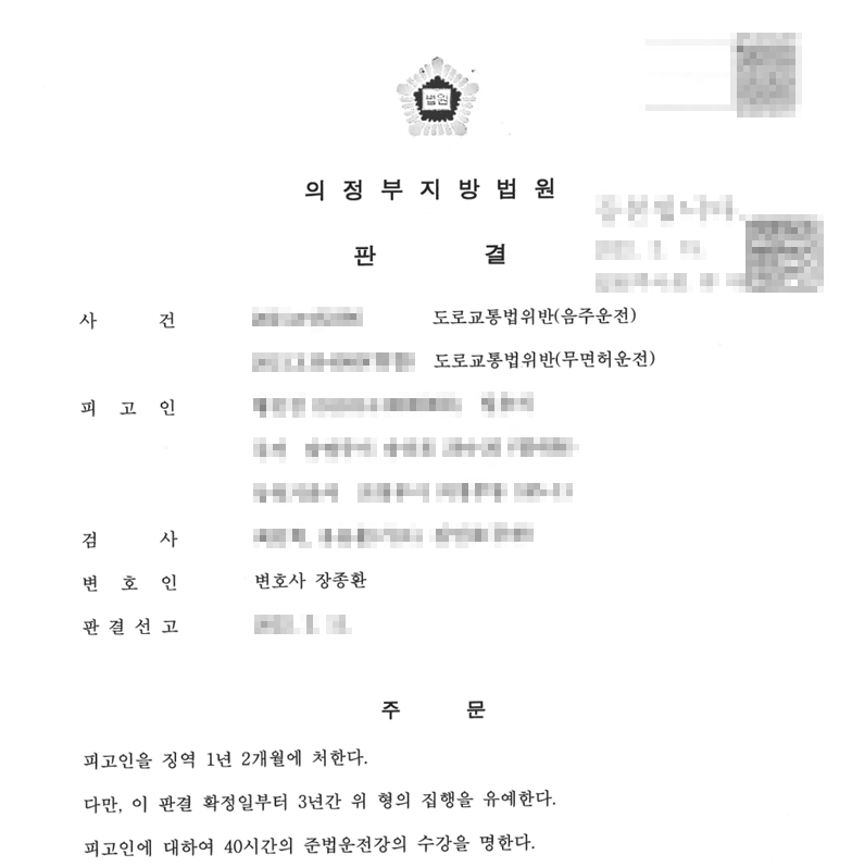 의뢰인은 기존에 음주운전으로 처벌 받은 전력이 있음에도 불구하고 2회째 음주운전을 하다가 적발 되었는데, 재판 도중 무면허운전까지 하여 추가적으로 병합되어 재판을 받게 되었습니다.