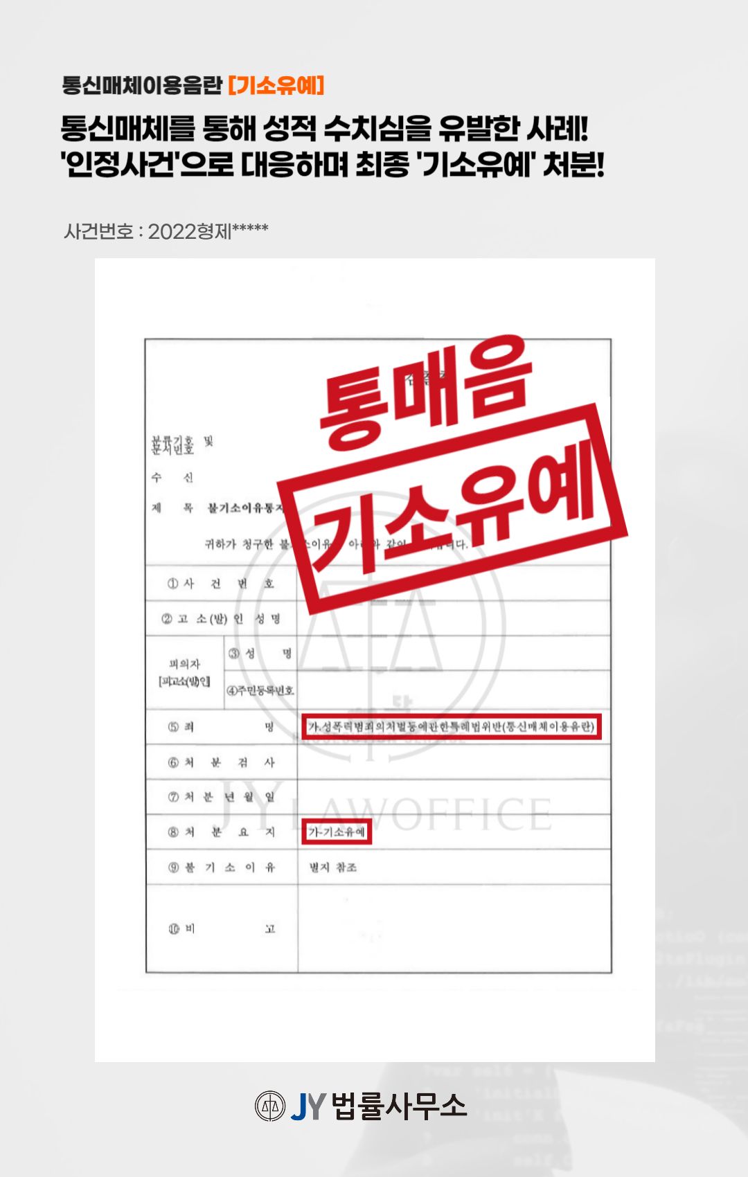 본 사건의 의뢰인은 통신매체를 통해 성적 수치심이나 혐오감을 일으킨 행위로 '통신매체이용음란죄'가 적용되었고, 원만하게 사건을 해결하기 위해 본 JY법률사무소를 찾아와 주셨습니다.