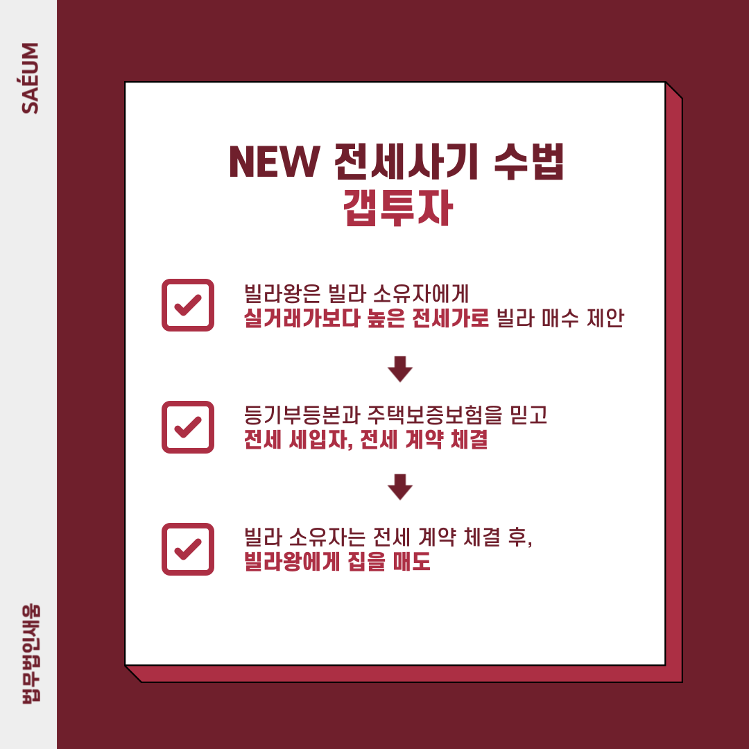 최근에는 "빌라왕"이라고 불리는 전세 사기로 인해 많은 임차인이 손해를 입는 사건들이 발생하고 있습니다. 정부가 이에 대한 대책을 강구하고 있지만, 이미 빌라왕은 전세보증금을 반환하지 않은 채로 사망한 경우가 많아, 피해자들은 실제로 재판 과정을 거친다고 하더라도 보증금을 반환받는 데 상당한 어려움을 겪을 것으로 예상되는데요. 전세사기의 유형은 다양하지만, 최근 흔히 알려진 수법은 "갭투자"로 알려진 사기 수법입니다. 갭투자는 주택을 전세로 임대하면서 매매 가격과 전세가격의 차이가 적은 집을 선택하여 구매하는 투자 방식을 말합니다.