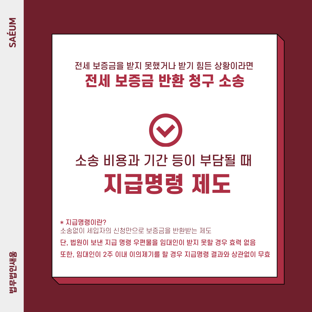 위와 같은 변수가 없다면 지급명령은 소송 대비 비용과 시간을 절약할 수 있지만 반면에 오히려 시간과 비용이 더 낭비되기도 합니다. 따라서 임대인이 보증금을 챙긴 후 잠적한 상황이라면 지급명령을 신청하기보다는 전세금반환소송을 진행하는 것이 바람직합니다. 다만 이러한 민사 소송절차를 밟더라도 보증금반환을 받기는 사실상 어렵습니다. 그러므로 전세사기 피해를 보지 않도록 임대차계약 시 미리 다음에 예기치 못한 상황에 대비하여 미리 예방할 수 있도록 해야 합니다.