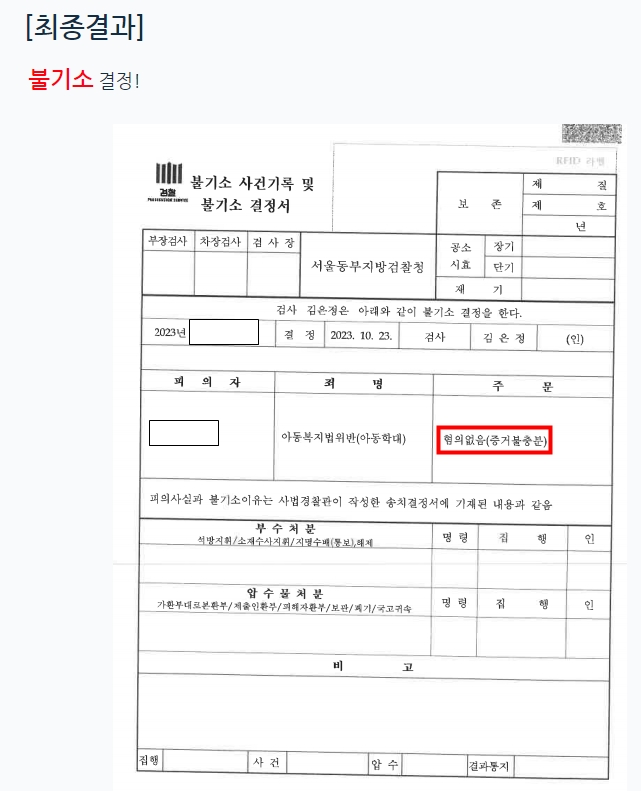 이렇게 노력을 한 끝에 결과는 불기소로 결정이 납니다.