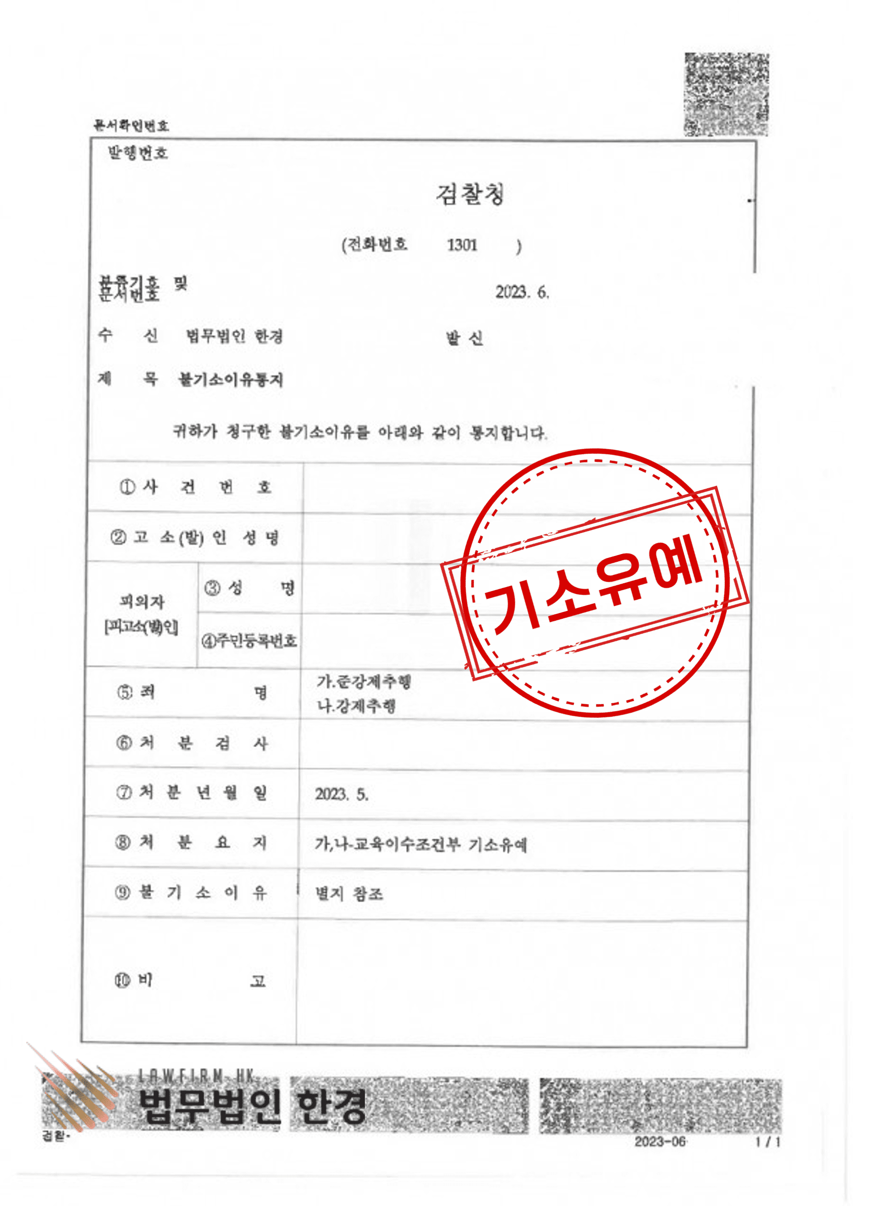 의뢰인 A씨는 입건 된 후 도움을 받고자 법무법인 한경을 찾아 대처 방안 등을 상담 받게 되었고, 의뢰인은 직업 등의 상황으로 기소유예 처분을 원하셨습니다. 법무법인 한경은 의뢰인에게 기소유예 가능성을 설명하였고, 의뢰인은 설명을 들은 뒤 법무법인 한경에 사건 의뢰를 하였습니다.