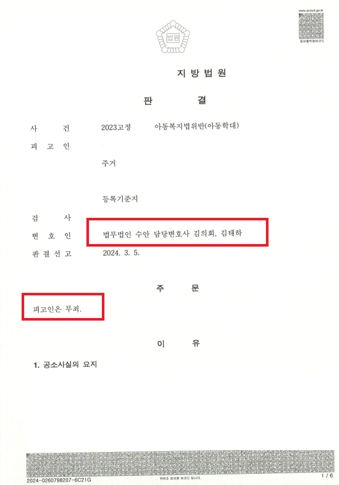 아동복지법위반(아동학대) 사건에서 무죄를 선고 받은 사안입니다.