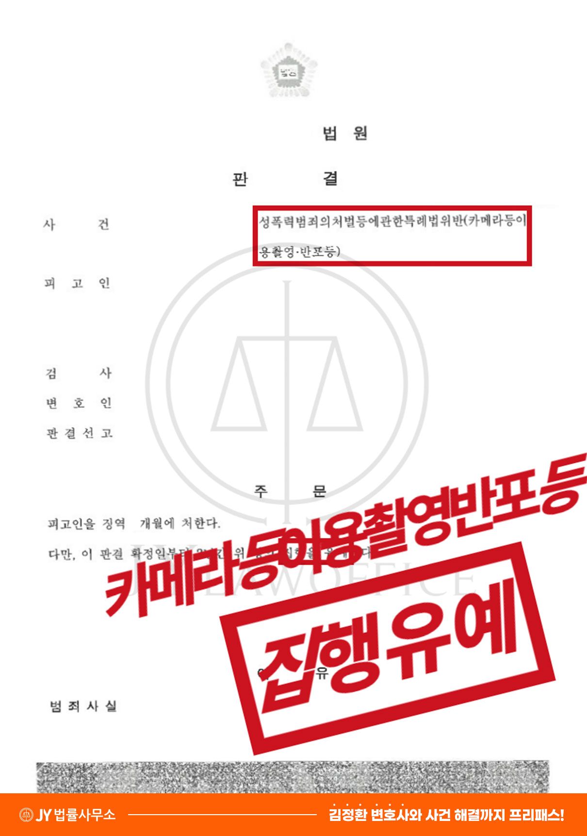 ‘카메라등이용촬영·반포등’의 혐의는 7년 이하의 징역 또는 5천만 원 이하의 벌금이 선고되는 중범죄에 해당합니다. 의뢰인의 경우, 사건 관련 촬영물 등 직접적인 증거가 있는 상황이었으므로 실형의 위험이 있었는데요. 이에 본 변호인은 의뢰인에게 유리하게 참작될 수 있는 사유들을 근거로 유리한 전략을 수립할 수 있도록 노력했습니다.