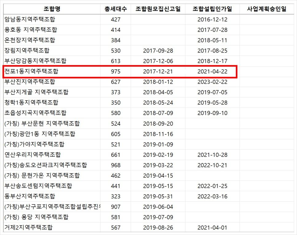 부산광역시청 홈페이지에서 제공한 자료에 따르면 부산에는 2024년 1월 기준으로 111개의 지역주택조합이 설립되어 있습니다. 그런데 이 중 사업계획승인 이후의 절차를 밟고 있는 34개의 지역주택조합을 제외하면 무려 77개의 조합이 모두 조합설립단계에 머물러 있어 토지확보에 큰 어려움을 겪고 있는 것으로 보여집니다. 또한 그 중에서도 전포1 지역주택조합, 암남동지역주택조합, 용호동 지역주택조합, 장림 지역주택조합, 부산당감동 지역주택조합, 부산진 지역주택조합 등을 비롯한 21개의 조합은 조합원모집신고 이후 무려 5년 이상 장기간 사업이 지체되어 심각한 문제점을 드러내고 있는데, 오늘은 그 중에서 최근 저희 법무법인 차원의 최동욱 변호사에게 상담문의가 많이 들어오고 있는 전포1 지역주택조합에 대해 좀 더 알아보도록 하겠습니다.