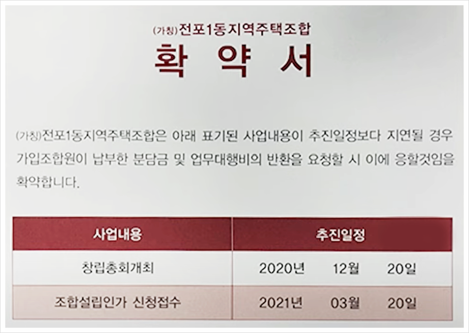 특히 전포1 지역주택조합 또한 조합원들이 계약을 체결했을때 "사업내용이 추진일정보다 지연될 경우 가입조합원이 납부한 분담금 및 업무대행비의 반환을 요청할 시 이에 응할것임을 확약합니다."라고 명시된 확약서 (안심보장증서)를 교부하여 주었습니다. 이러한 전액환불을 약속하는 안심보장증서는 전국의 수많은 다른 지역주택조합에서 교부한 것과 같이, 이미 법원으로부터 법적으로 실효성이 없다고 판단받은 문서입니다.