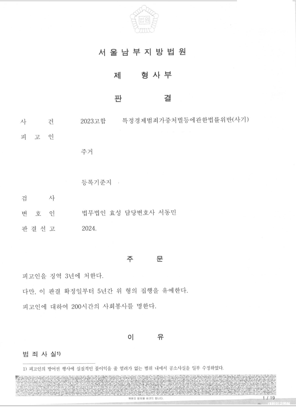 저는 즉각 변호인의견서를 제출하여 이 사건의 경위, 기망행위의 부존재, 피해액의 부존재, 수익액의 부존재 등을 주장하고 다른 한편으로 합의 등 양형사유를 주장 입증하여 법원은 집행유예를 선고하였습니다.