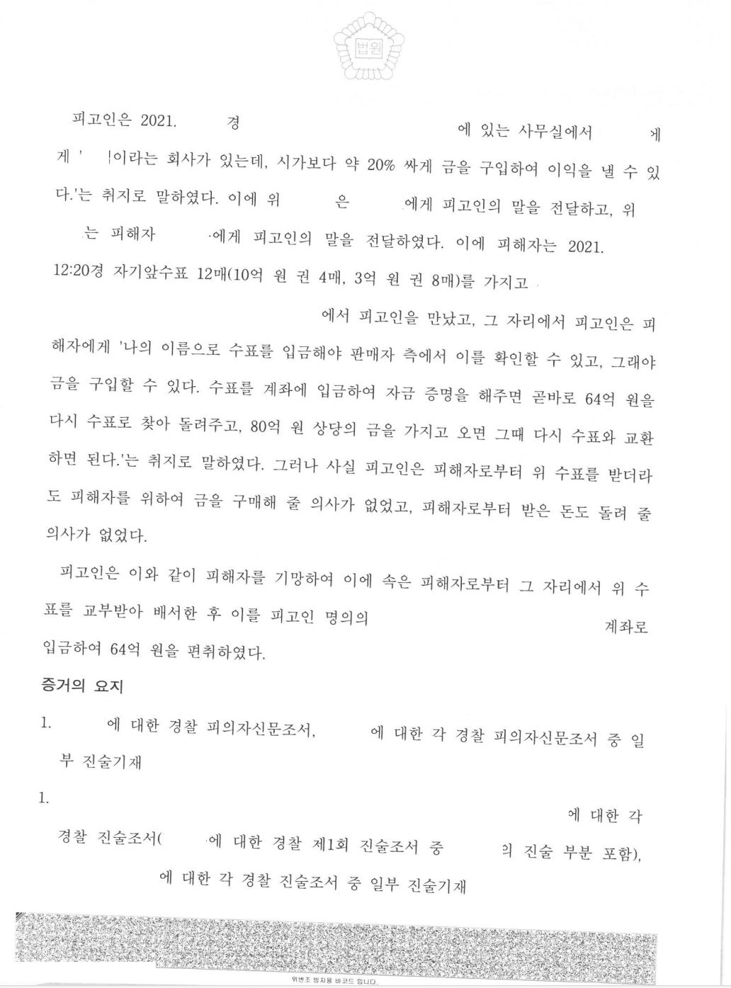 의뢰인은 피해자에게 금 투자 관련 기망을 하여 피해자로부터 수십억 원을 편취하였다고 특정경제범죄가중처벌등에관한법률위반(사기)로 기소되어 급히 저를 찾아오셨습니다. 공소장에 기재된 편취액이 너무 커서 구속 및 실형의 위험성이 큰 사안이었습니다.