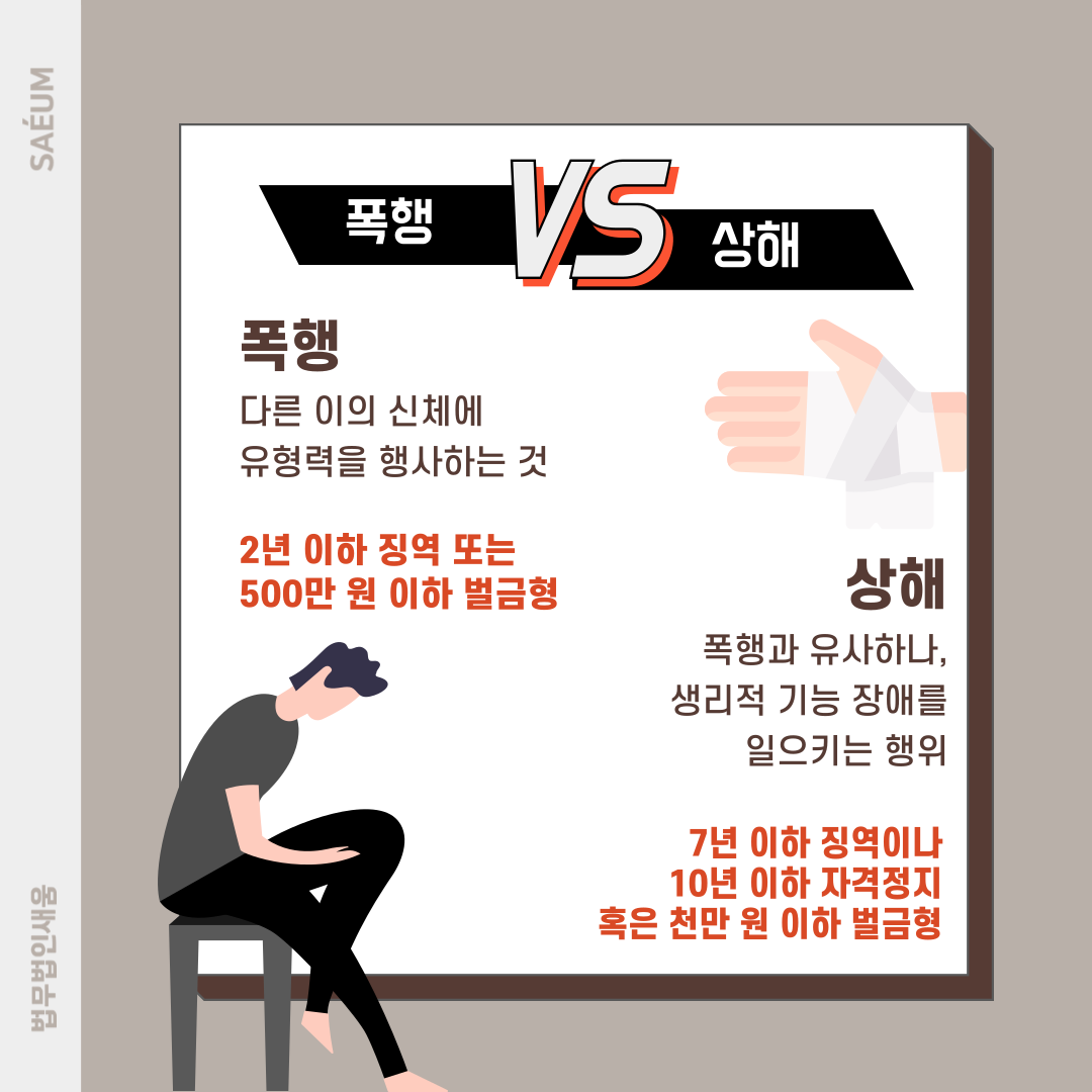 폭행은 다른 이의 신체에 유형력을 행사하는 것으로 직접 때리거나 밀치는 것은 물론 담배 연기를 얼굴에 내뿜는 행위 등을 폭넓게 포함하고 있습니다. 만일 이런 문제 행위를 하는 경우 2년 이하 징역이나 500만 원 이하 벌금이 내려오게 됩니다. 상해는 이와 비슷한 개념이라 혼동하는 분들이 많은데, 이는 생리적 기능에 장애를 일으키는 행위를 말합니다. 폭력을 행사하여 몸이 부러지거나 하는 등의 행위는 물론이고 먹는 음식에 위험한 물질을 넣는 행위, 성병을 감염시키는 행위 등이 모두 포함이 됩니다. 이처럼 일정 기준 이상의 피해가 발생하는 경우에는 상해로 보고 있으며, 혐의가 인정되는 경우 7년 이하의 징역이나 10년 이하 자격 정지 혹은 1,000만 원 이하 벌금형에 처하게 될 수 있습니다.