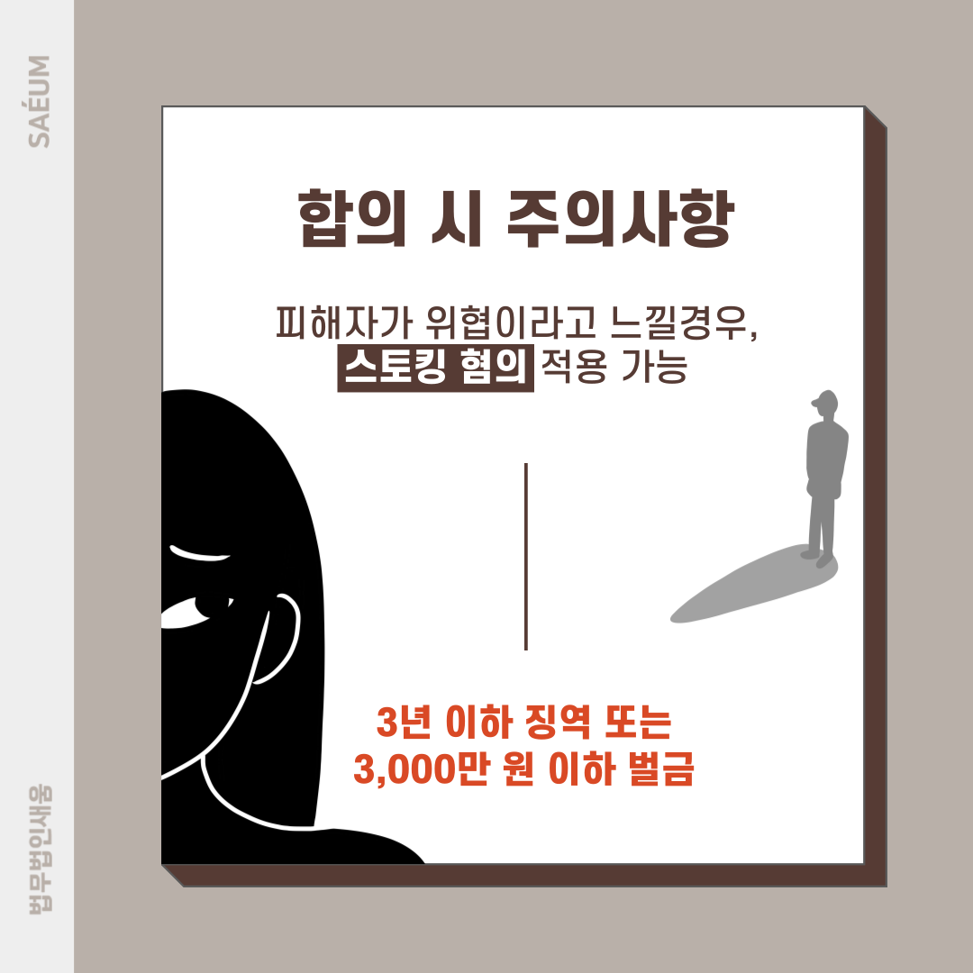 또한 상대방이 이를 문제 삼아 법적 대응에 나서게 되는 경우 스토킹 혐의도 적용 받게 될 수 있습니다. 이전에는 특별히 해를 가하지 않고 연락하거나 찾아가는 것을 반복하는 경우 별도로 벌을 내리지는 않았으나, 이와 같은 행위를 그대로 방임한 결과 피해자들의 인명피해로 이어지게 됨에 따라 이제는 별도의 처벌법을 만들어 처벌하고 있습니다. 만일 혐의가 인정되는 경우에는 3년 이하 징역이나 3,000만 원 이하 벌금에 처할 수 있는데, 계속해서 거부함에도 불구하고 연락하거나 찾아오는 행위 등이 이에 속하게 됩니다. 그렇기에 자신의 감형을 위해서 과하게 접근하는 경우 처벌을 받게 될 수 있으니 주의하여 대처해야 합니다.