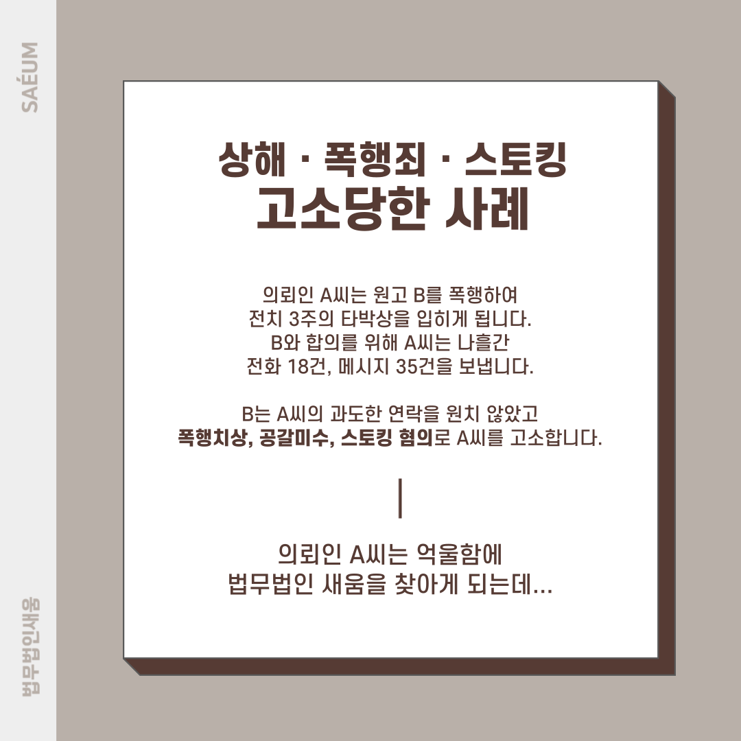 A씨는 B씨를 폭행하여 전치 3주의 흉부 타박상을 입히게 됩니다. 이에 A씨는 합의하자며 4일 동안에 무려 18건의 전화와 35개의 메시지를 보내게 됩니다. B씨는 A씨의 과도한 연락을 원치 않았고, 결국 A씨를 폭행치상, 공갈미수, 스토킹 등의 위반 혐의로 고소하게 되었고, 이에 의뢰인은 억울하게 처벌 받지 않기 위해 법무법인 새움을 찾아오시게 되었습니다.