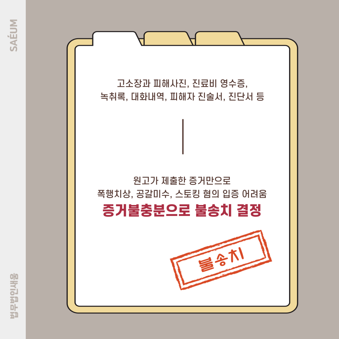 또한 고소장과 피해 사진, 진료비 영수증, 녹취록, 대화내역, 피해자 진술서, 진단서 등의 증거만으로는 폭행치상과 공갈미수, 스토킹 등의 혐의에 대해 입증하기 어려움을 강조하였습니다. 그 결과 증거불충분으로 불송치 결정이 내려왔고 해당 사건을 조기에 마무리할 수 있었습니다.