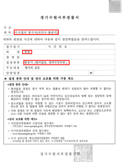 그 결과 최종 폭행 불송치 결정을 받을 수 있었는데요.