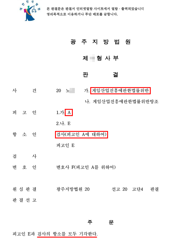 - 이전 포스팅 중 피고인들이 광주 모 지역 게임장에서 게임기 70대를 설치하여 운영하면서 피고인 A는 게임장 전체 운영과 관리를 하였고 공범 6명과 함께 범행을 저지르다 형사재판을 받은 사례를 소개해 드렸습니다.