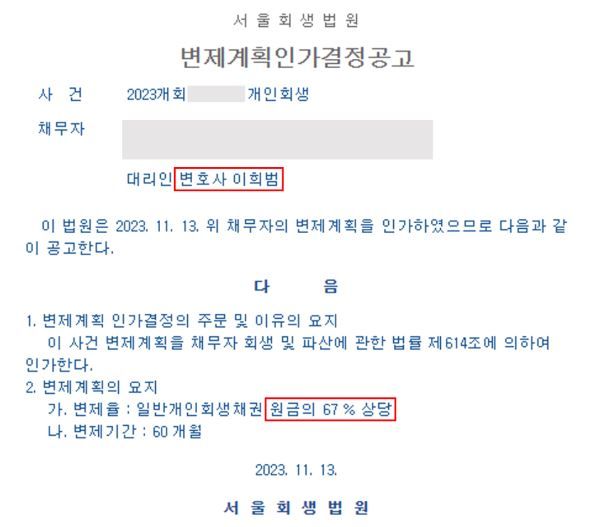[ 개인회생 성공사례 ] 변제율 : 원금의 67%