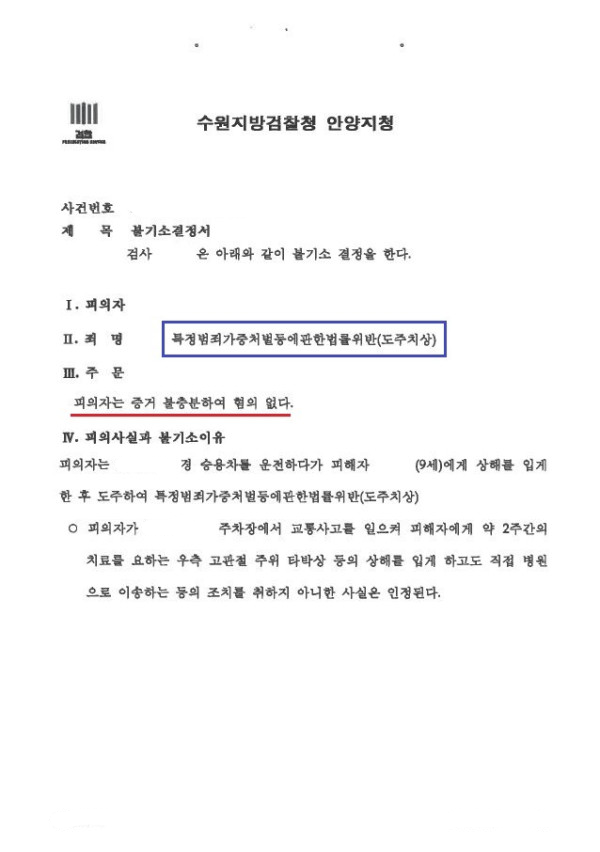 사건 초기단계부터 재판까지, 위드로가 철저하게 사건을 진행한 결과로 뺑소니에 대해 무혐의 처분을 받게 되었습니다.
