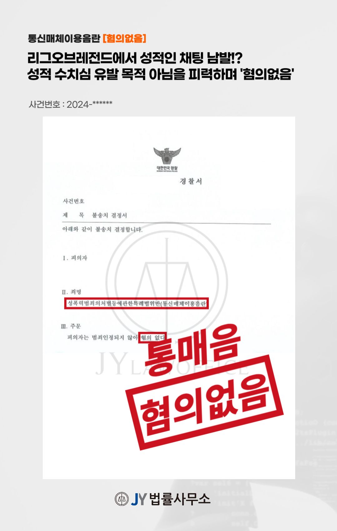 본 사건의 의뢰인은 '리그오브레전드' 라는 온라인 게임을 하던 중 상대방에게 성적 수치심을 주는 채팅을 전달한 혐의로 '통신매체이용음란' 혐의를 받게 되었습니다. 이에 의뢰인은 이후 대응 방안에 대해 자문하고자 본 JY법률사무소를 찾아주셨습니다.