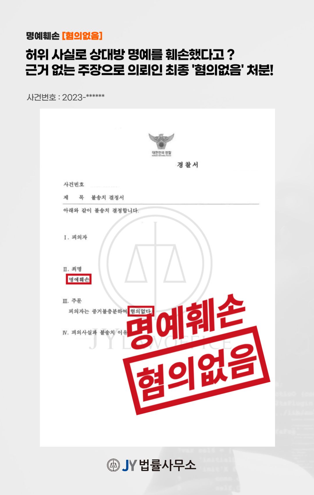 이와 같은 변호인의 조력에 따라, 의뢰인은 '명예훼손' 혐의에 대해 '혐의없음' 을 처분받아 사건을 종결할 수 있었습니다.