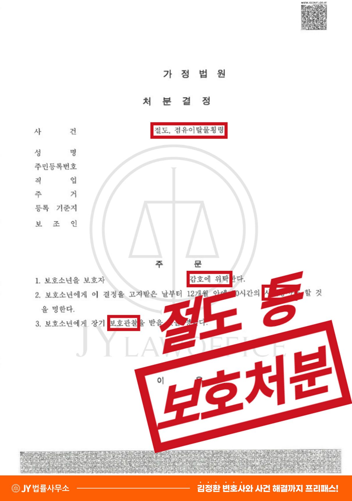 이와 같은 변호인의 노력에 따라, 의뢰인은 소년보호처분 중 1, 3, 5호 처분만을 결정받고 무사히 사건을 종결시킬 수 있었습니다.