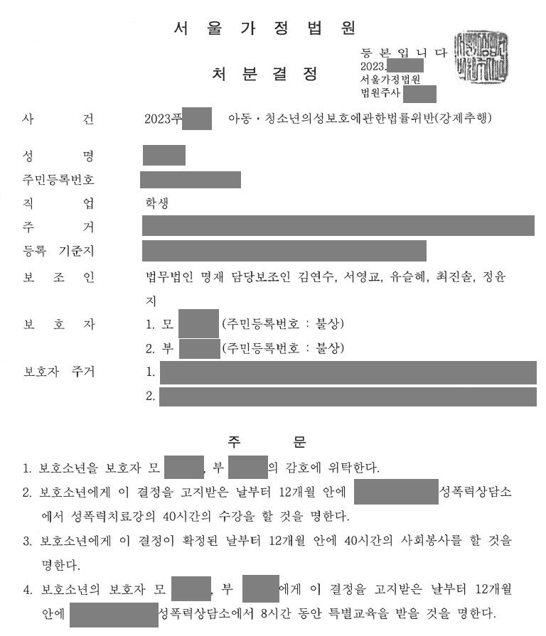 사건은 가정법원으로 넘어갔고 가정법원은 보호자인 부모의 감호 위탁, 성폭력치료강의 수강, 사회봉사 명령을 내렸습니다. 학생은 다행히 소년법 1호, 2호, 3호 처분만 받고 아무런 전과 없이 사건을 마무리한 것입니다. 법원도 부적절한 행동이지만 성교육을 통해 충분히 교정할 수 있고 강제추행죄를 인정해서 전과까지 만들 정도는 아니라고 판단한 것입니다.